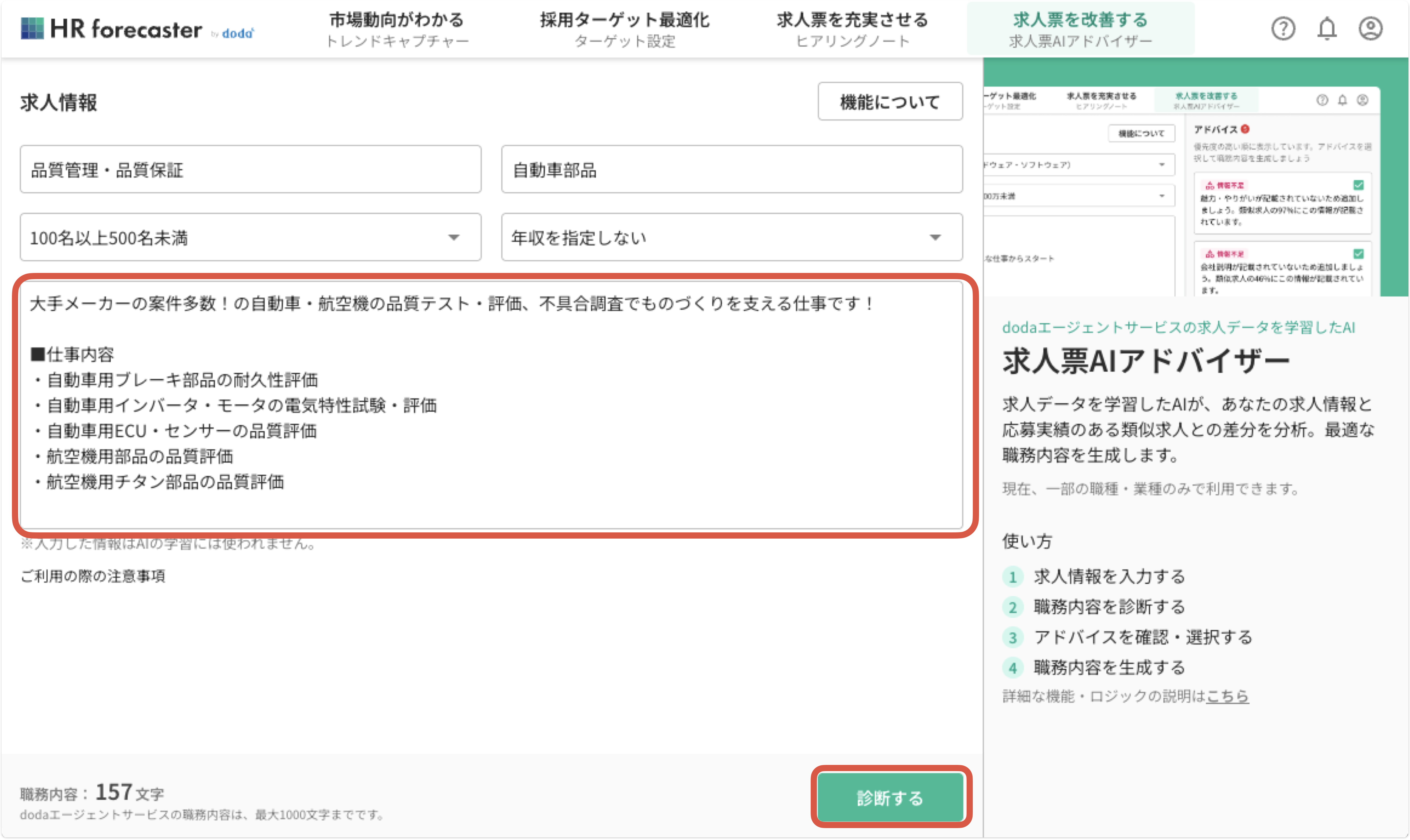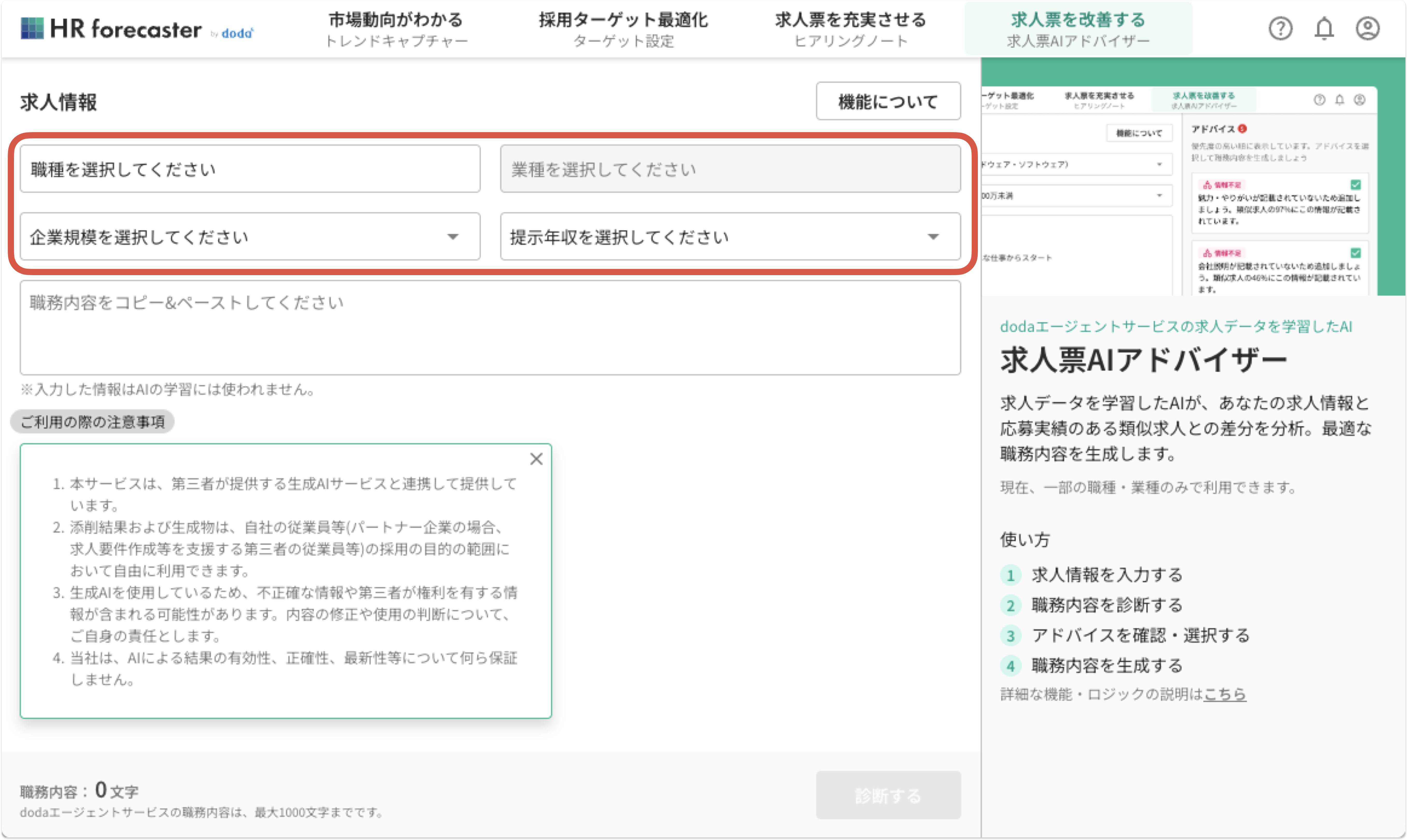 1. アドバイザー画面左上部から診断したい求人の4つの基本情報を入力する