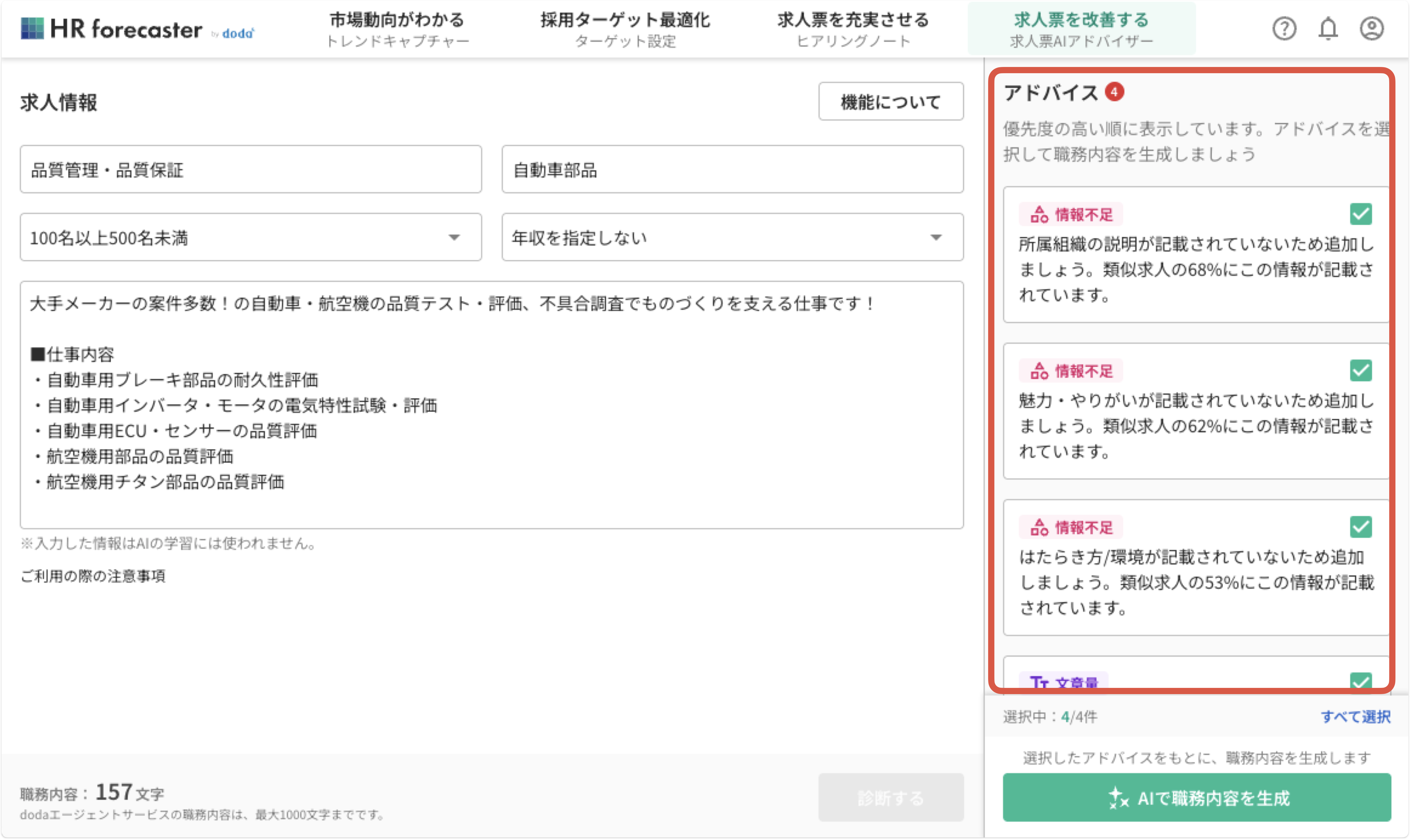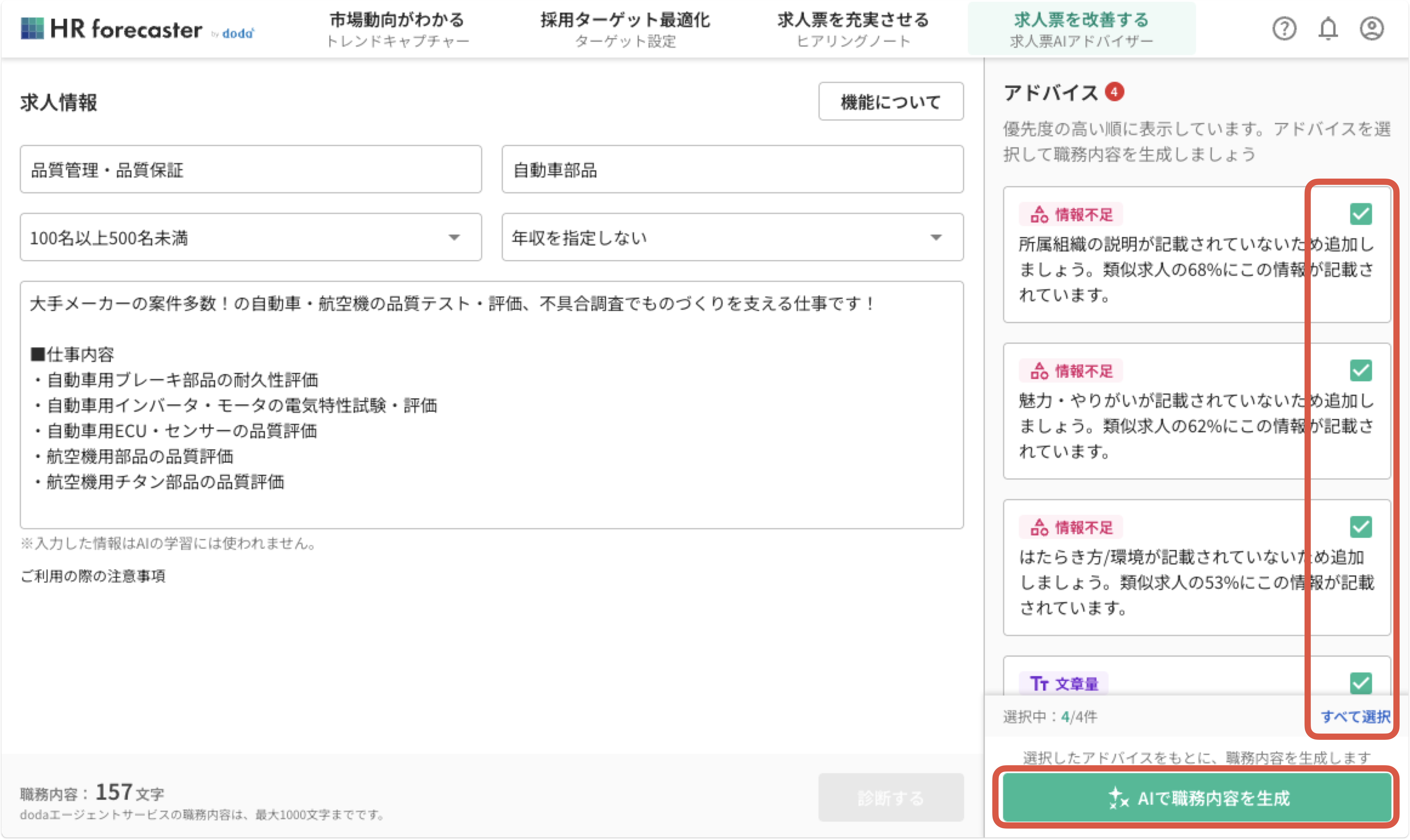 4. 不要なアドバイスのチェックを外し、「AIで職務内容を生成」ボタンを押す