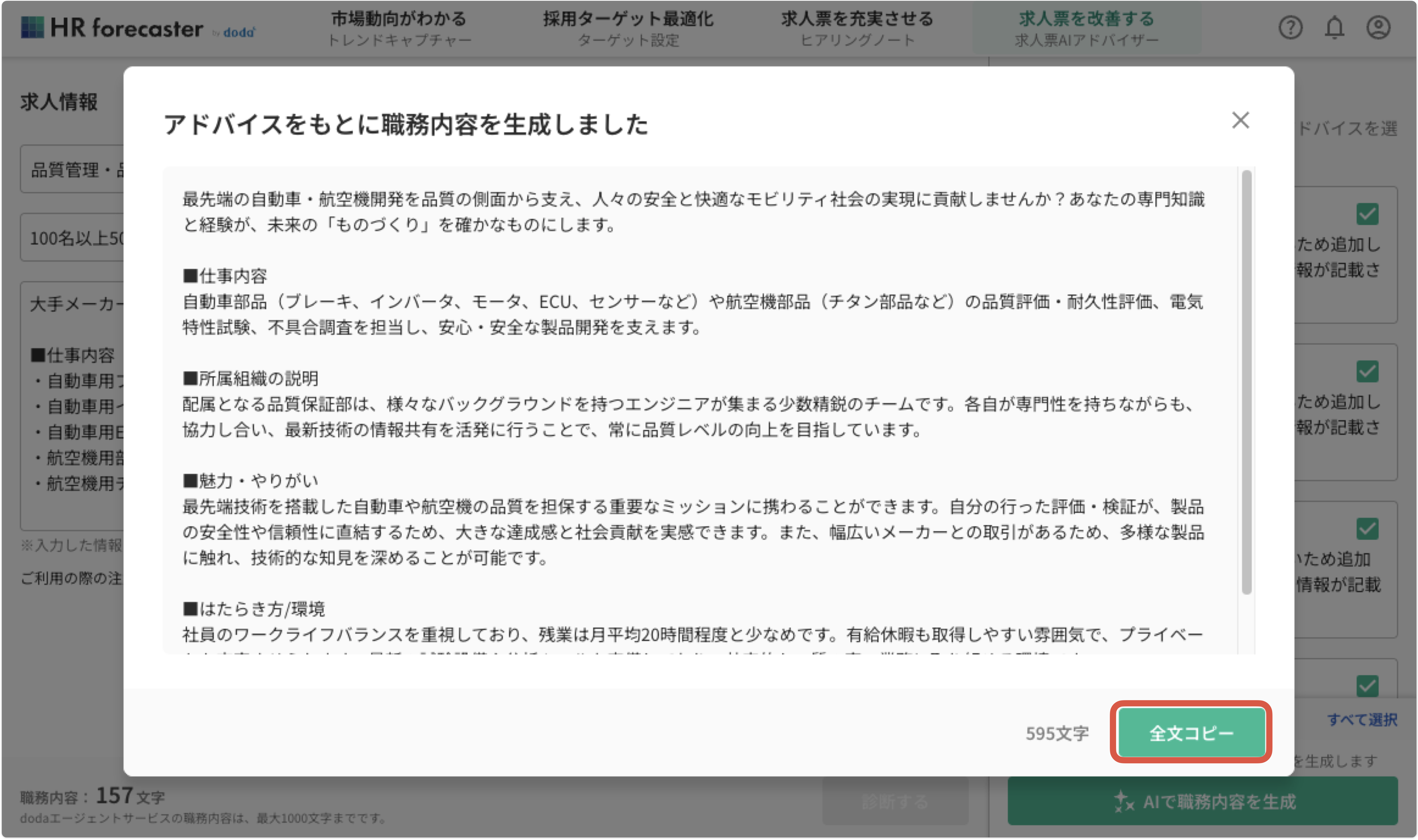 初期の入力データとアドバイスから「職務内容」の文章が生成されます。求人票の作成・見直しにお役立てください。